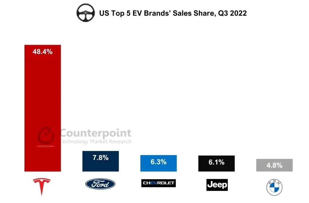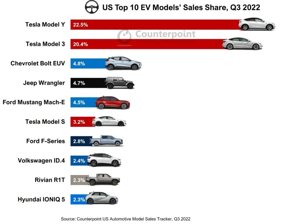 依据 Counterpoint 全球乘用车车型出售追寻数据,虽然宏观经济逆风,但美国电动汽车 (EV) 销量在 2022 年第三季度同比增加近 52% 。纯电动汽车 (BEV) 占美国电动汽车总销量的 80% 以上。第三季度纯电动汽车销量同比增加超越 78%。特斯拉第三季度的销量超越了排名在这以后 15 个品牌的总和。